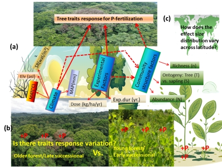 (a) 图叙述气候因子(年均温、太阳辐射、海拔和年均降水量)、磷素添加实验因素(剂量和实验持续时间)以及森林结构属性(物种丰富度、多度和发育)与树木性状(森林生产力和光合性状)间的关系。实线表示直接效应,虚线表示间接效应。(b) 图表示幼龄林/演替早期阶段森林及老龄林/演替后期阶段的森林树木光合特性和生产力对磷素添加响应。“+P”表示磷添加。(c) 图表示树木光合特性和生产力对磷素添加响应随纬度变化。