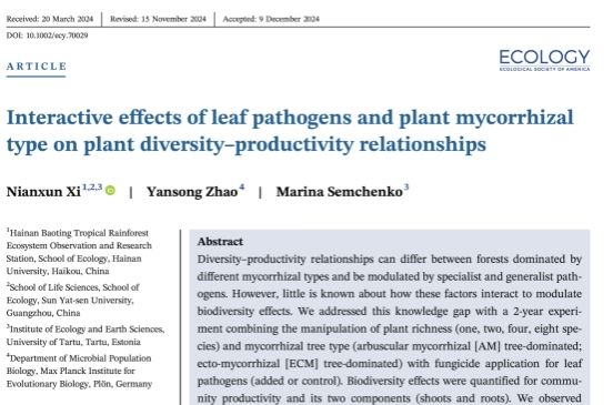 生物多样性与生产力的关系是群落生态学的经典主题之一。在不同菌根植物占优势的森林中,该关系可能存在差异,并受到专化与泛化病原菌的调节。然而,目前的研究尚未充分揭示这些因素如何相互作用以调节生物多样性效应。通过开展同质园实验,本研究构建了两种不同类型的植物群落:以内生菌根植物为主的群落和以外生菌根植物为主的群落。同时,设置不同的物种多样性梯度,并使用杀菌剂去除叶片病原菌。研究发现,在外生菌根树种占优势的群落中,生产力在低至中等多样性时增加,而在物种多样性最高时下降,表现出非线性的多样性-生产力关系。杀菌剂的添加降低了互补效应,并提高了单种和八物种群落中外生菌根树种的生产力。这一发现表明,专化病原菌的稀释效应和泛化病原菌的溢出效应分别在低多样性和高多样性群落中调节生产力,从而导致单峰的多样性-生产力关系。在以内生菌根树种为主的群落中,施加杀菌剂后,八物种群落的生产力显著增加,且在单种群落中,生长较快的物种受到的促进作用更大。这一发现表明,由于植物在生长与防御之间存在权衡,泛化病原菌的溢出效应对快速生长物种的抑制作用更为明显。本研究揭示了由于植物菌根类型的差异以及植物与病原菌之间存在不同的专化性关系,植物多样性与生产力之间的关系呈现出非线性特征。