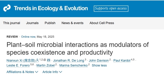 近日,海南大学生态学院席念勋以第一作者兼独立通讯作者在Trends in Ecology & Evolution发表了题为“Plant-soil microbial interactions as modulators of species coexistence and productivity”的综述文章,从理论上阐明土壤微生物调节植物物种共存及多样性影响生产力的理论基础,然后据此解释不同微生物类群(专化微生物,泛化微生物)如何调节物种间的生态位和适合度差异,进而通过互补效应和选择效应影响生产力,并据此推断两类机制之间的关联。研究认为不同的土壤微生物类群对植物物种共存和多样性-生产力关系可能有截然不同的影响,具体取决于植物-土壤微生物互作的类型和专化性。此外,与植物产生对抗性关系或者互利性关系的其他类群(比如叶际微生物、传粉者、食草昆虫等)也可能通过类似的机制调节植物物种共存和生态系统功能。塔尔图大学的Marina Semchenko教授、Martin Zobel教授以及瑞典农业大学Paul Kardol教授等为本文的共同作者。